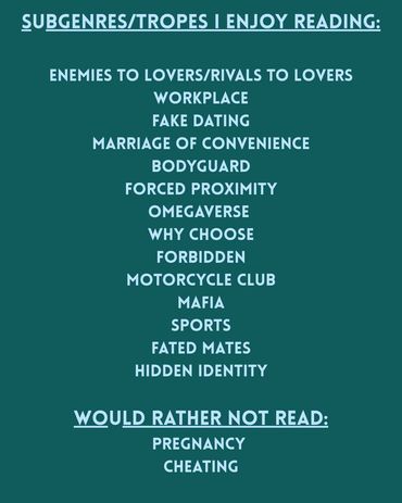 I would rather not read about cheating or pregnancy between main characters. Though, I don't mind if the characters already have kids.