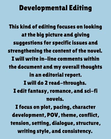 I will provide feedback on big picture issues like plot, character, pacing, POV, etc.